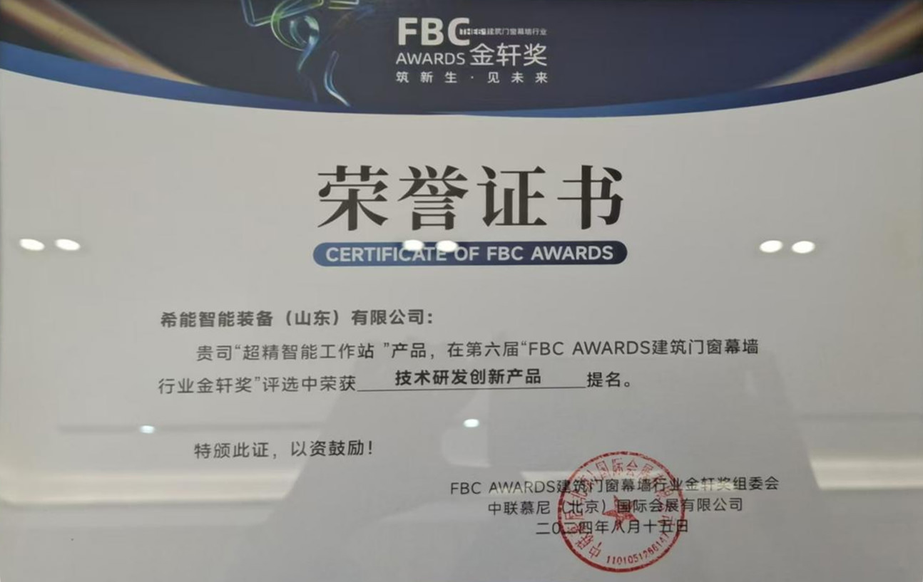 2023年,公司的“超精智能工作站“产品,在第六届“FBC AWARDS建筑门窗幕墙行业金轩奖”评选中荣获技术研发创新产品提名。我司被增补为山东省建筑门窗幕墙行业协会第七届理事会理事单位。