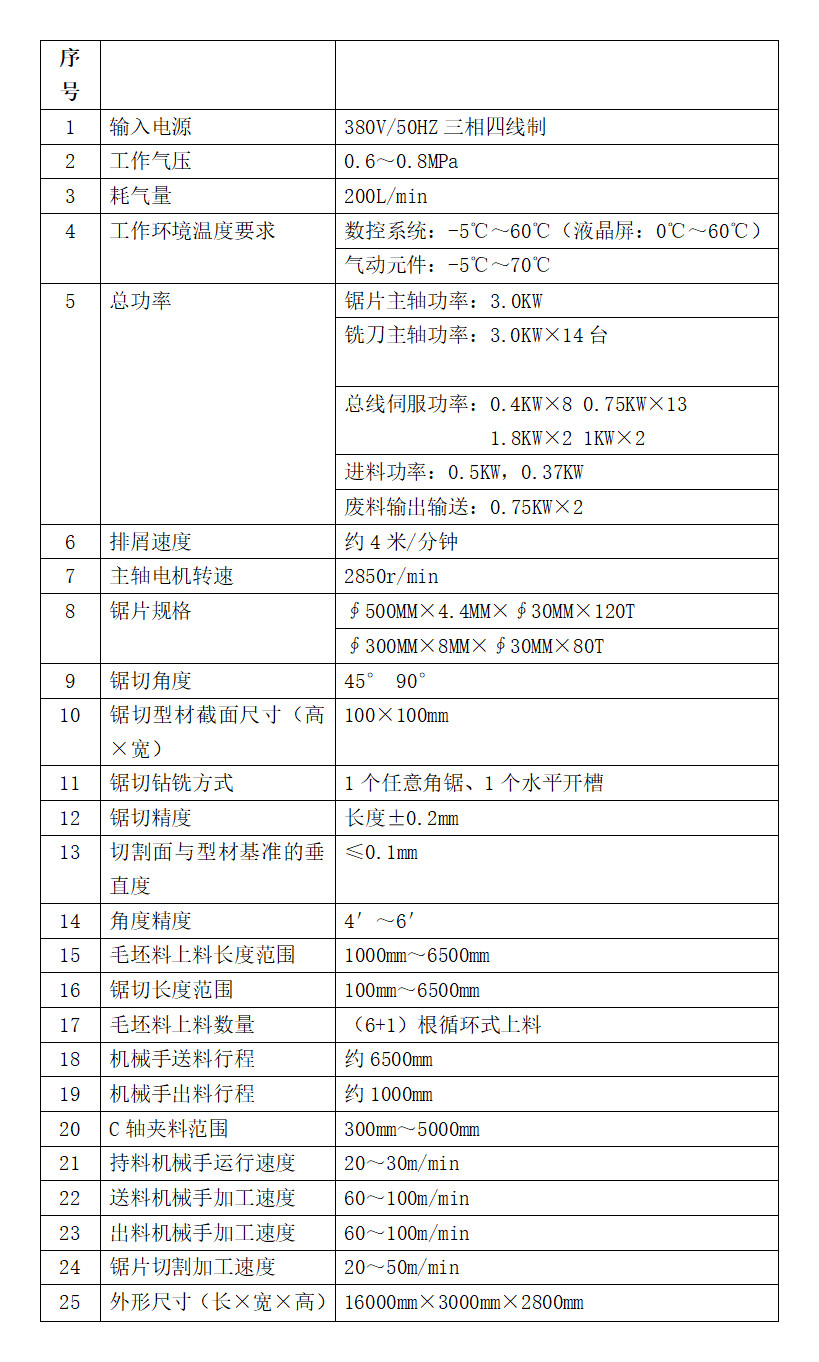 该机由上料输送模块、复合加工仓、出料输出模块三部分组成,从而实现循环作业原料到成品料的单角高效锯切+双工位四方向14轴钻铣+上下方铣槽自动化作业。