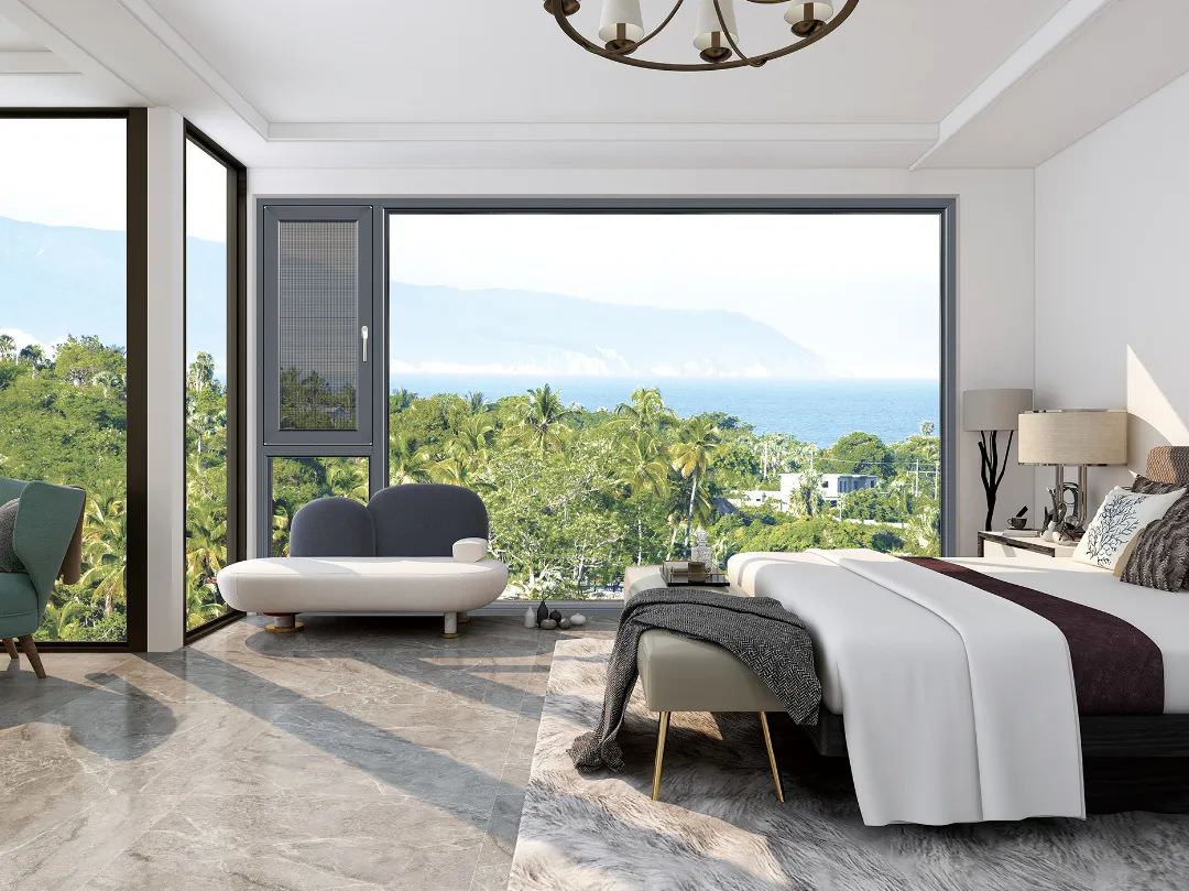 希能设备制造的门窗,超大中空玻璃全景落地窗,大视野、大空间!以其时尚大气的别致魅力,唤醒沉闷的家居空间,让您随时随地体验180°全景式视野。